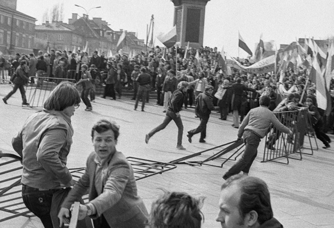 Polish Solidarity trade union members bravely protest against martial law in Warsaw, May 1982, facing dispersal by ZOMO riot control police in the Polish People’s Republic.