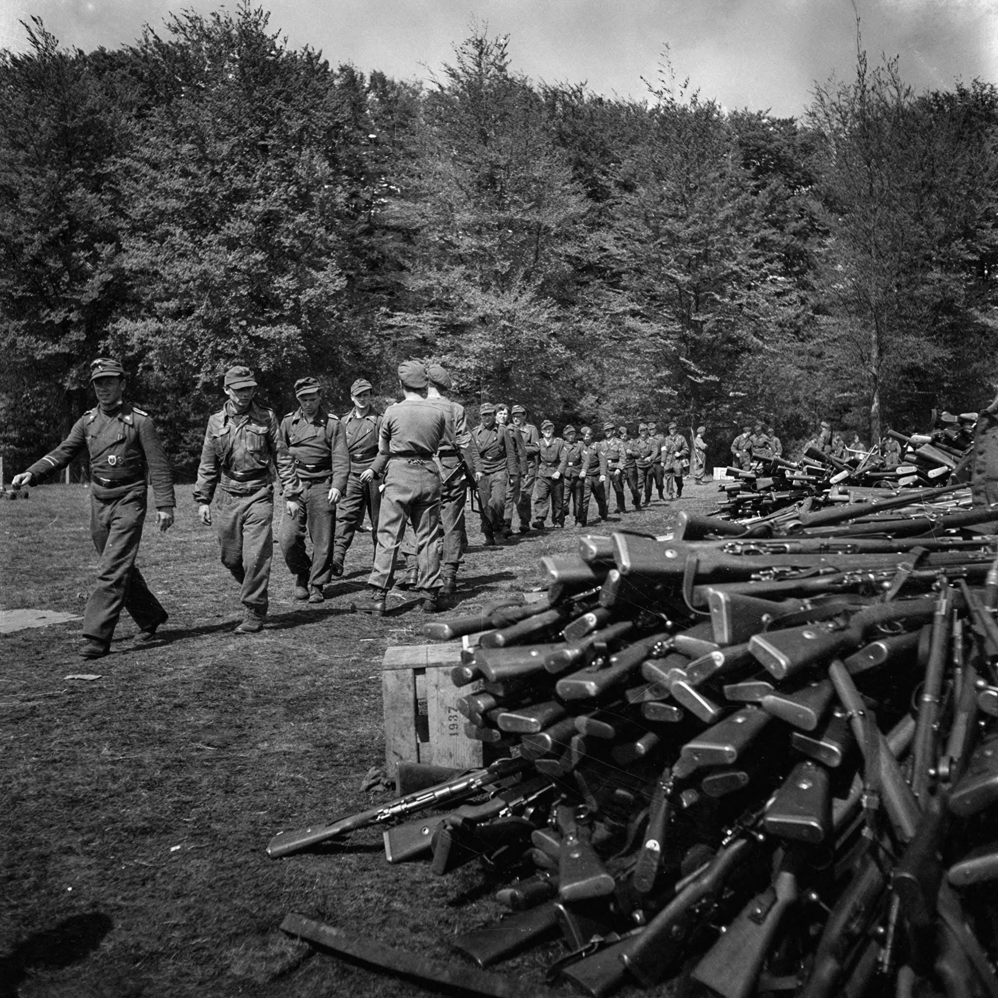 German soldiers surrender their weapons in Soest, May 10, 1945, marking the end of WWII in Europe.