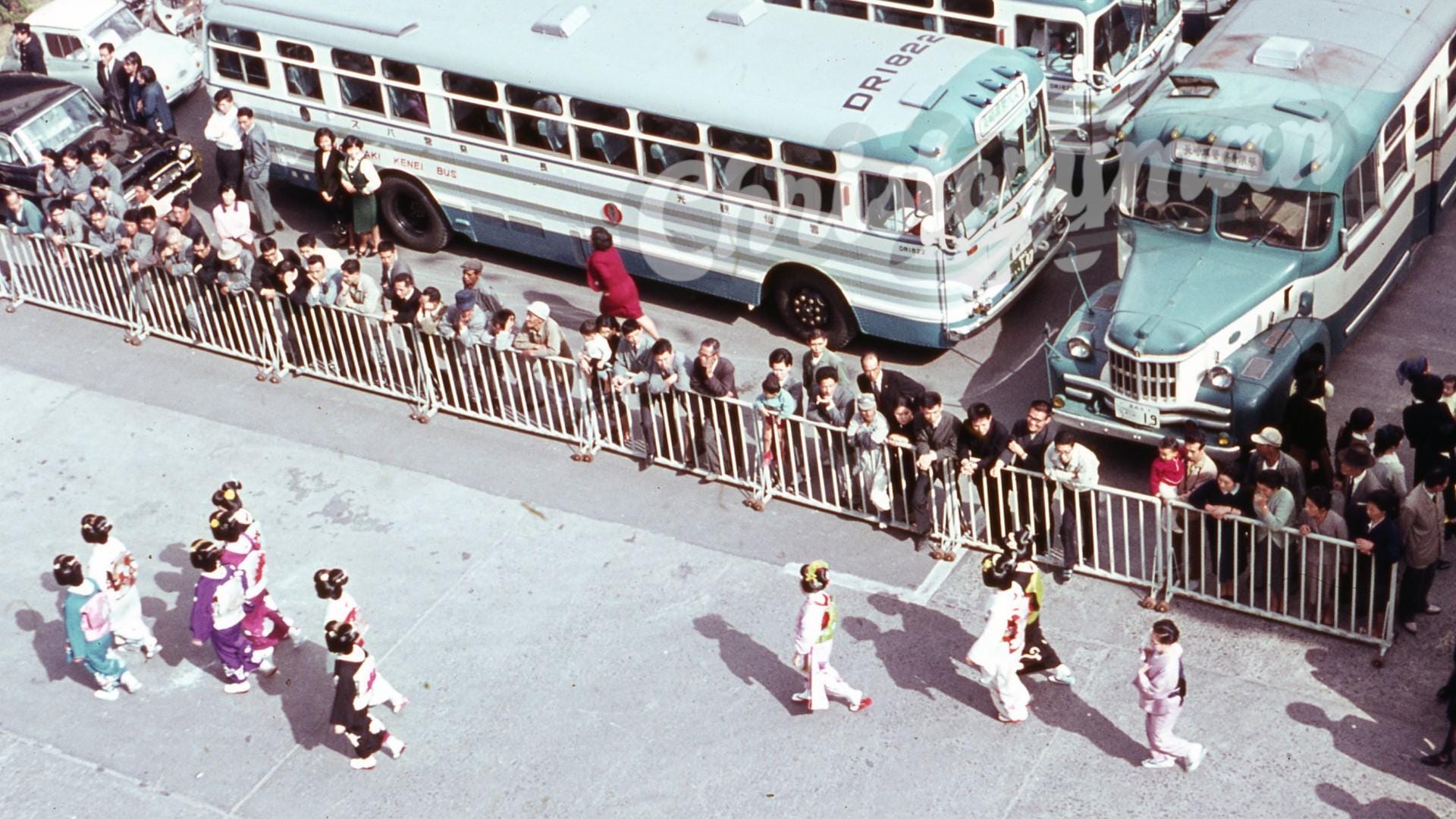 A captivating street scene from Japan, likely Yokohama, 1966, featuring a geisha alongside bustling buses.