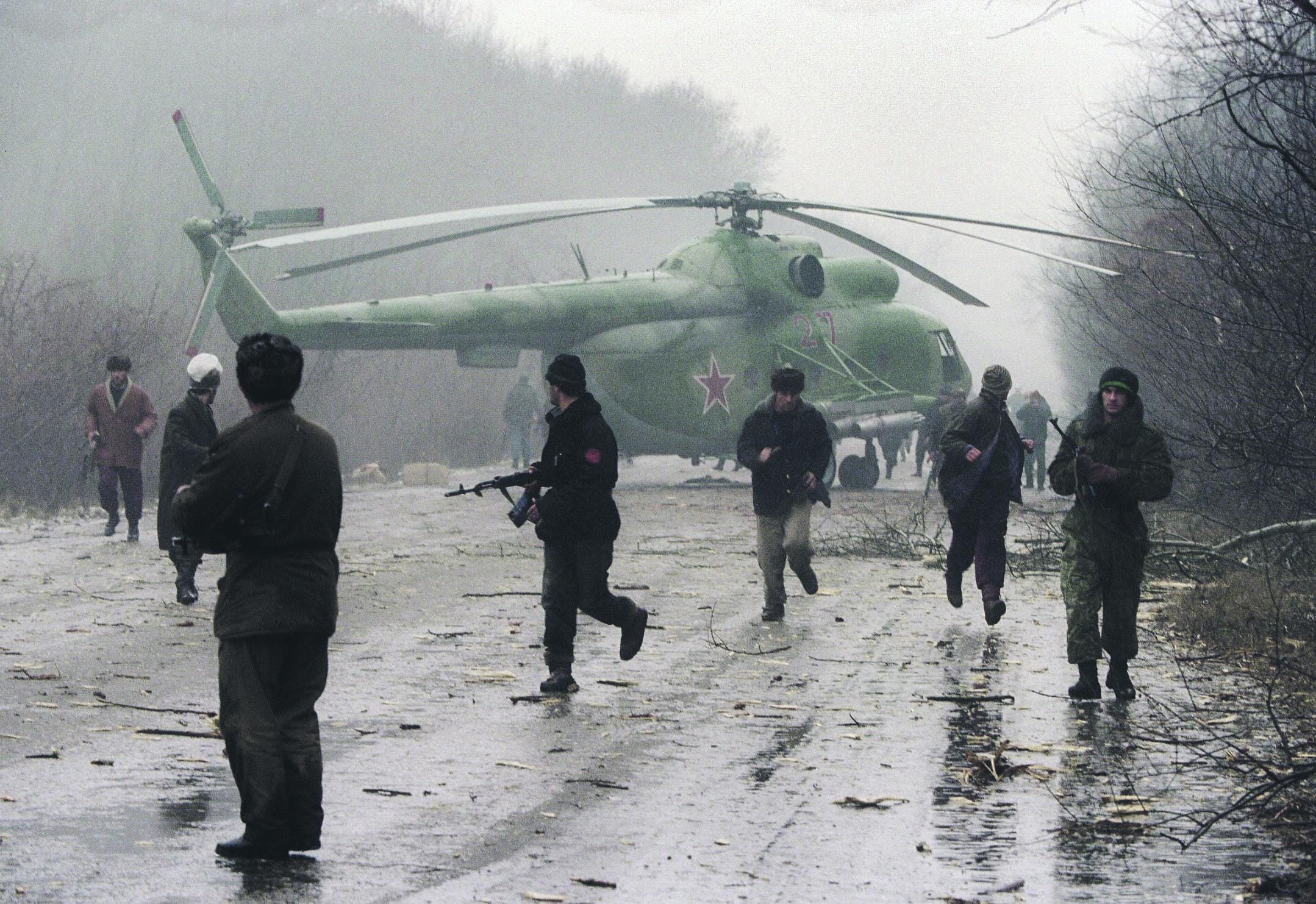 A Russian Mil Mi-8 helicopter, dramatically brought down by Chechen fighters near Grozny, Chechnya, in December 1994.
