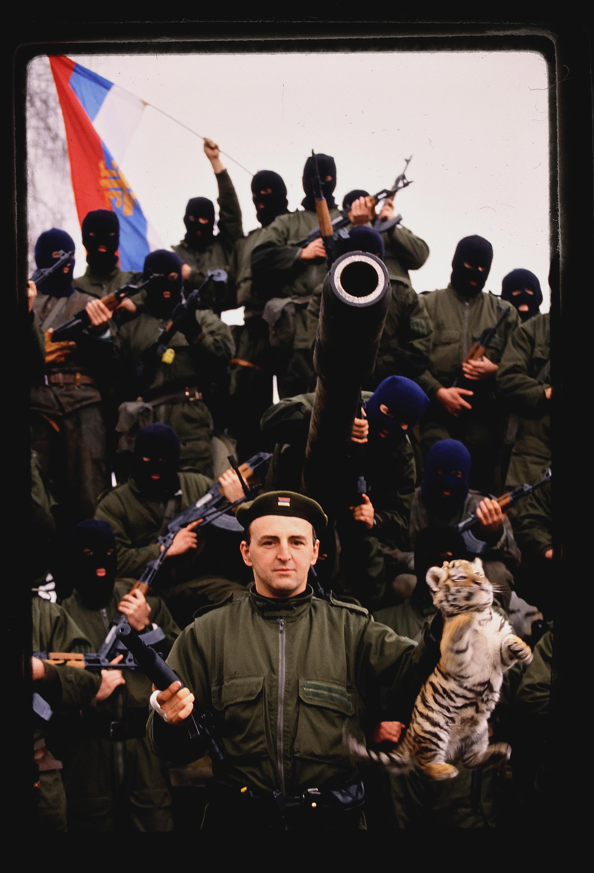 Serbian mobster and warlord Željko Ražnatović, known as “Arkan,” holding a baby tiger in 1991. His unit, the Serb Volunteer Guard, was notorious for war crimes, and Ražnatović himself was one of Serbia’s most feared figures, escaping jail twice before his assassination in 2000.