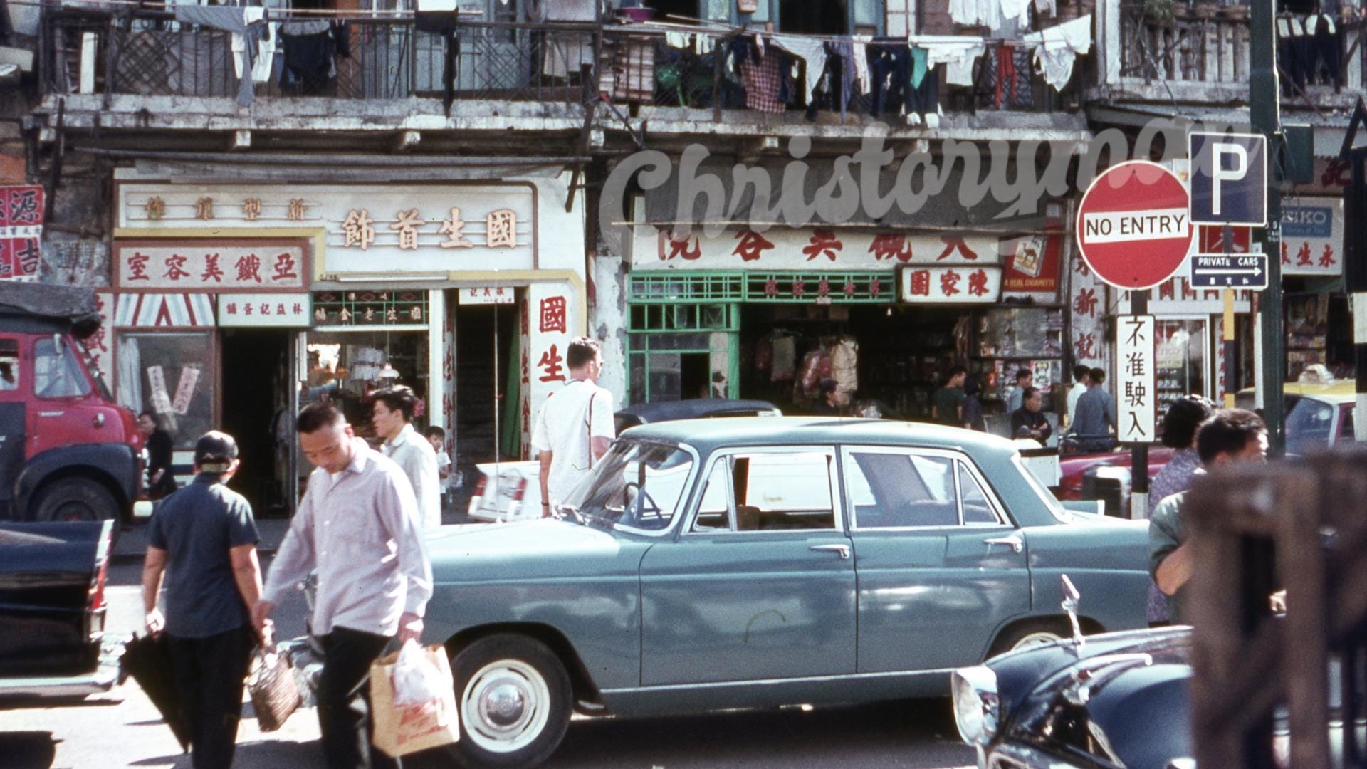 A bustling street view captures the vibrant life of Hong Kong, then a Crown Colony, in 1966.