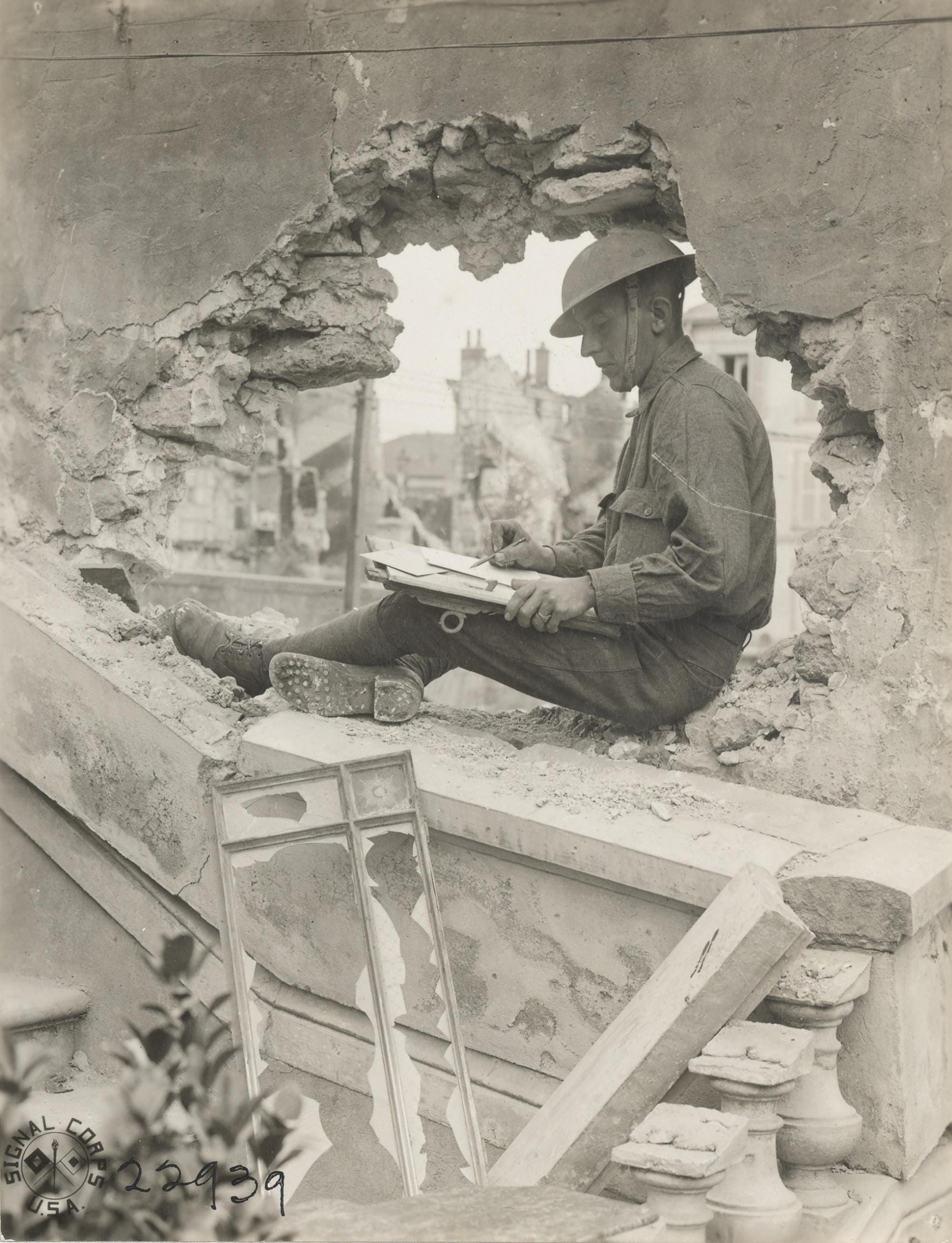 A poignant moment from WWI: a U.S. soldier composes a letter amidst the ruins of a shelled-out wall in Château-Thierry, 1918.