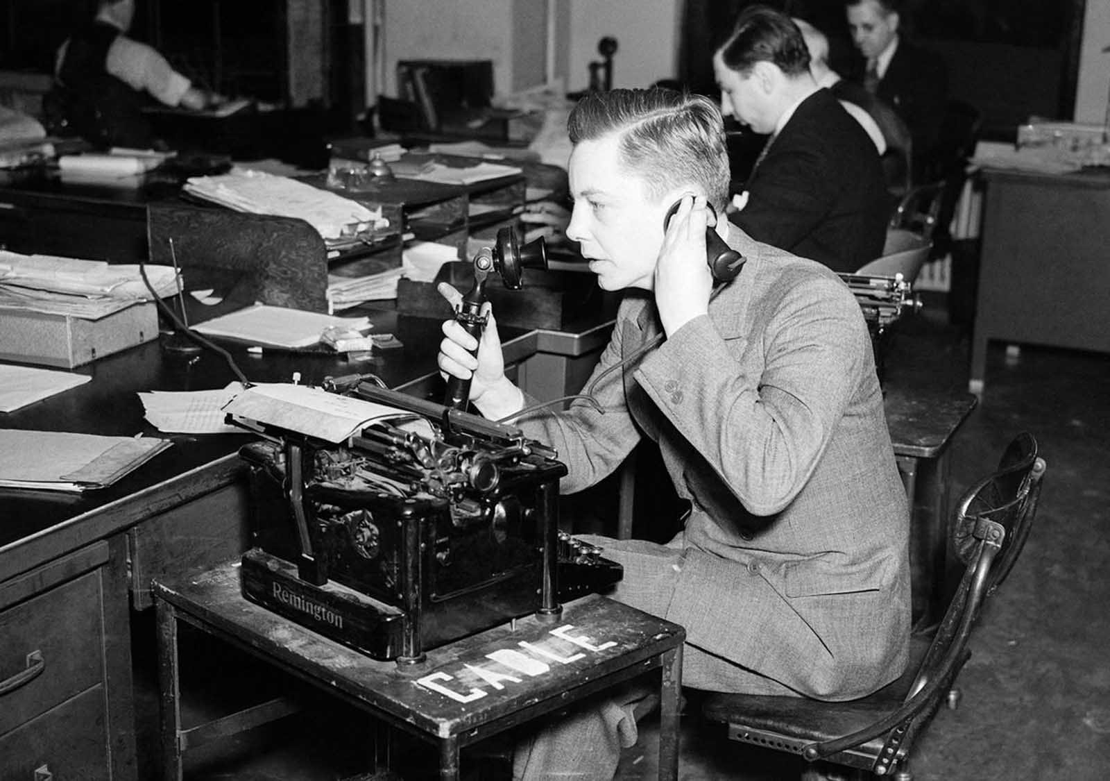 A crowd in Washington D.C. reads 'Bombs Rain On Warsaw' headlines outside the U.S. State Department on September 1, 1939, as diplomats discuss the escalating European conflict.