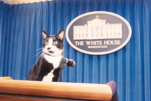 Socks, the First Feline, making himself at home in the White House Press Briefing Room, a beloved companion during the Clinton years.