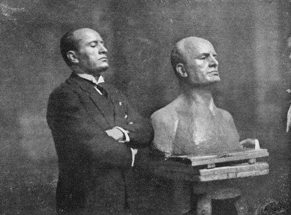Benito Mussolini striking a pose next to a bust of himself in 1926, reflecting his growing cult of personality.