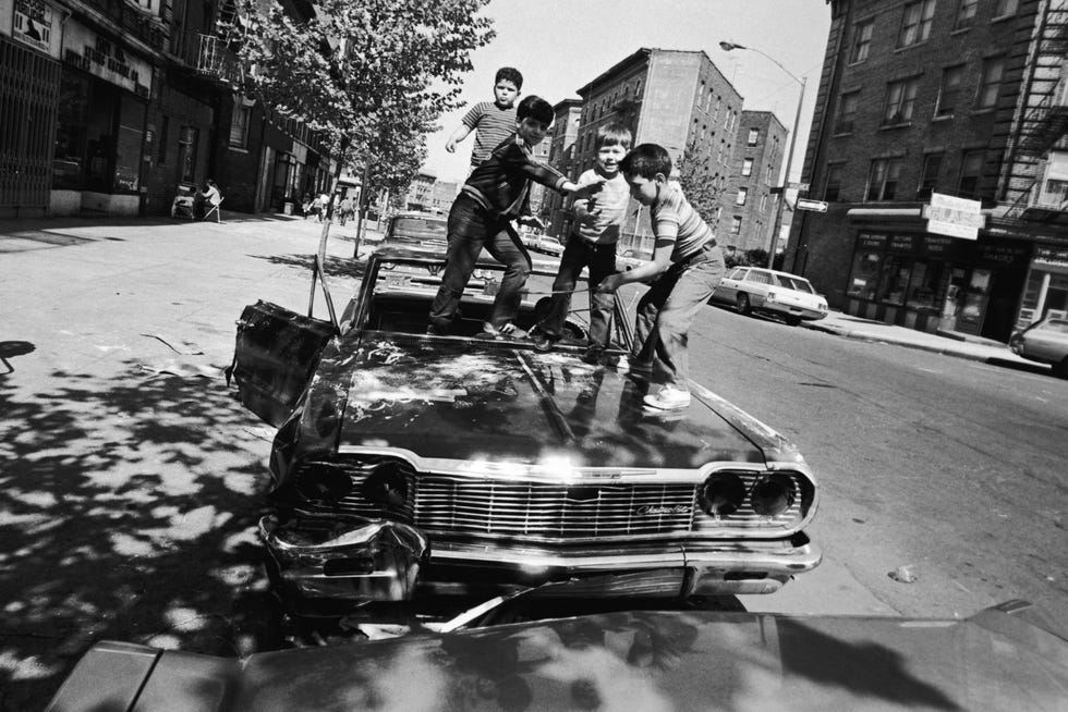A view down a tenement-lined street, depicting the residential character of 1970s NYC neighborhoods.