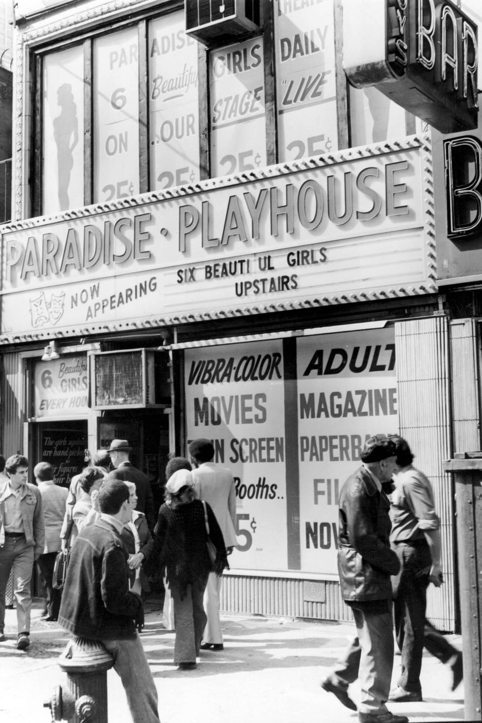 Reflecting the grit and glamour: a street scene in downtown Manhattan, 1970s.