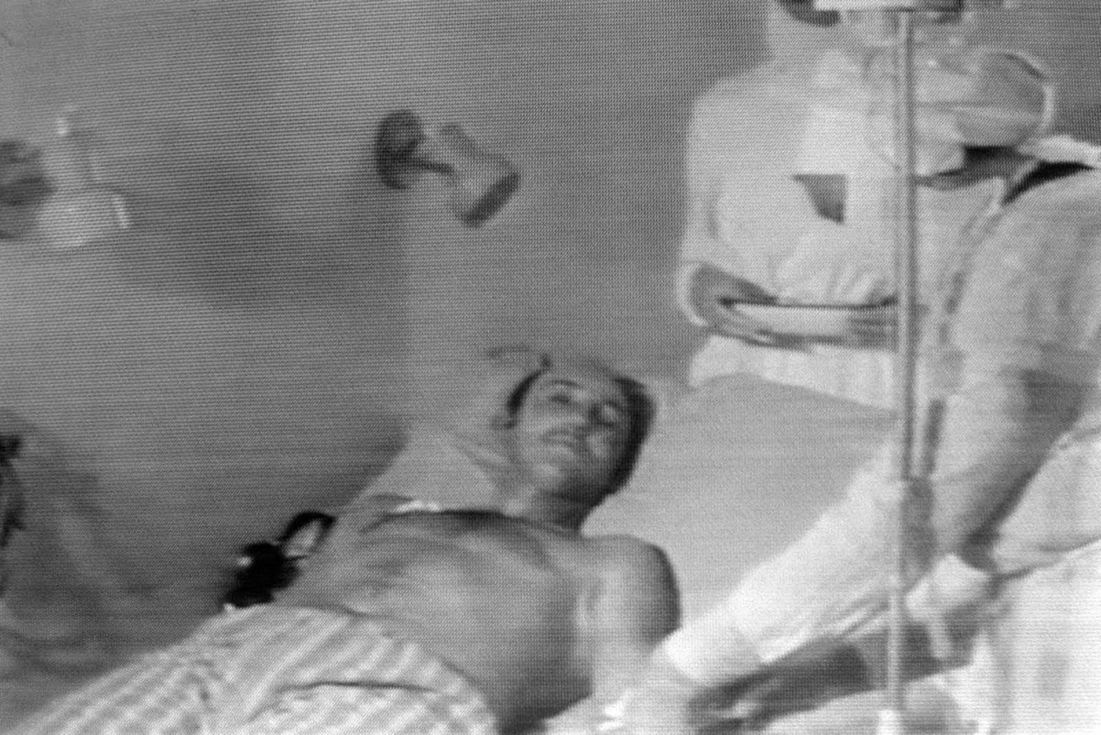 At Moscowโs No. 6 radiation clinic, a patient recovers from a bone-marrow operation, examined by a doctor through a sterile, isolated chamber to prevent contamination.