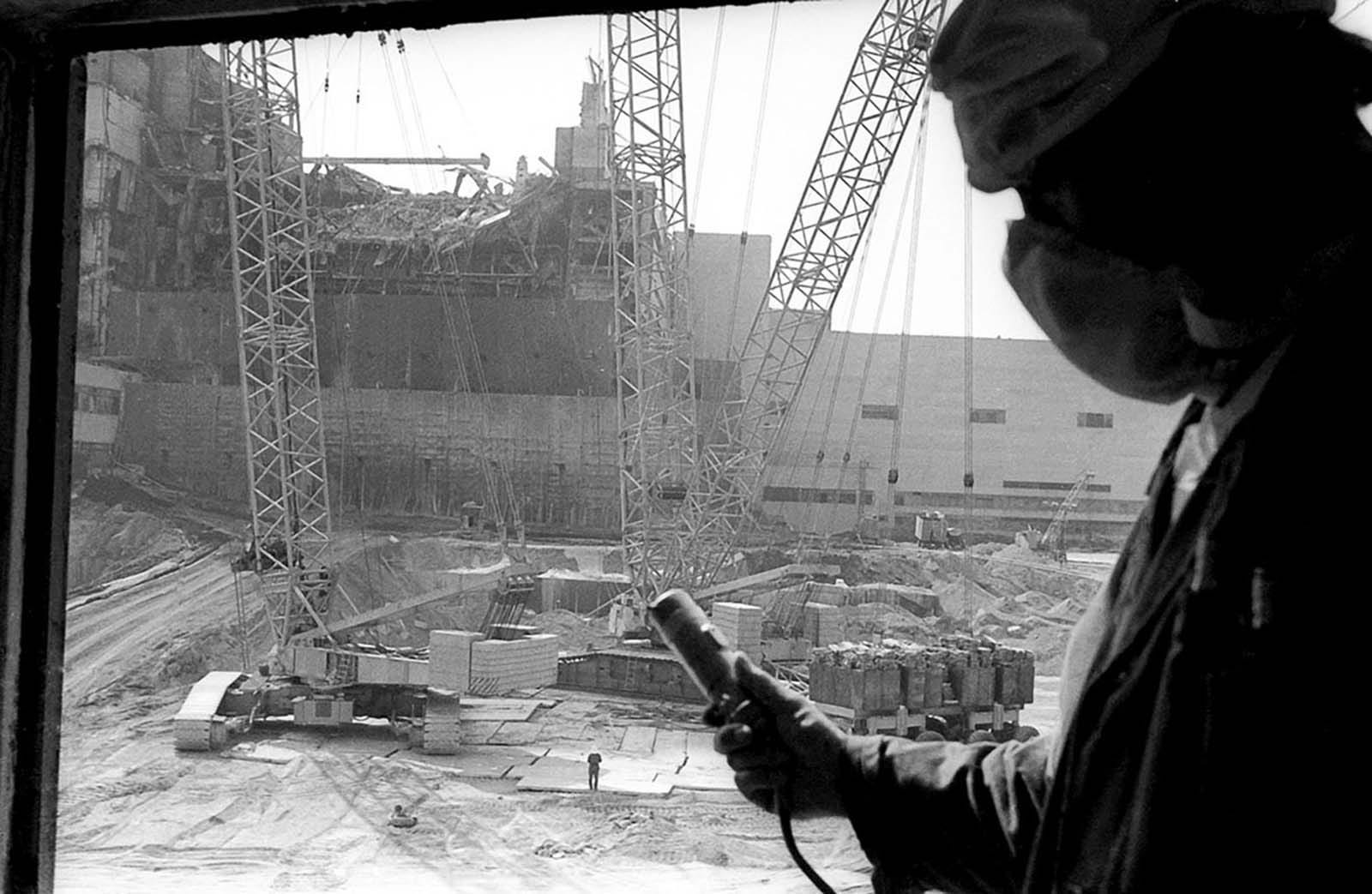 An aerial view captures the ongoing repair and containment efforts at the damaged Chernobyl nuclear plant throughout 1986.