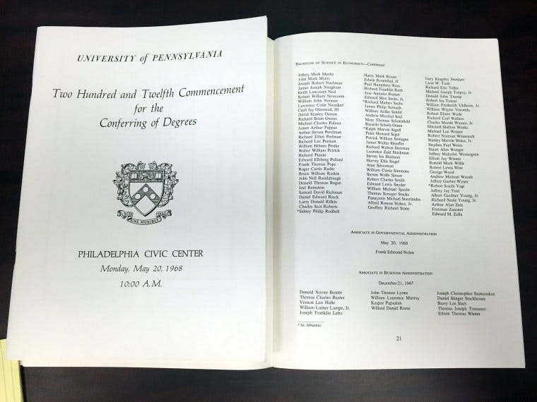 A program from the 1968 University of Pennsylvania graduation, listing Donald Trump's name for a Bachelor of Science degree in economics from the Wharton School.