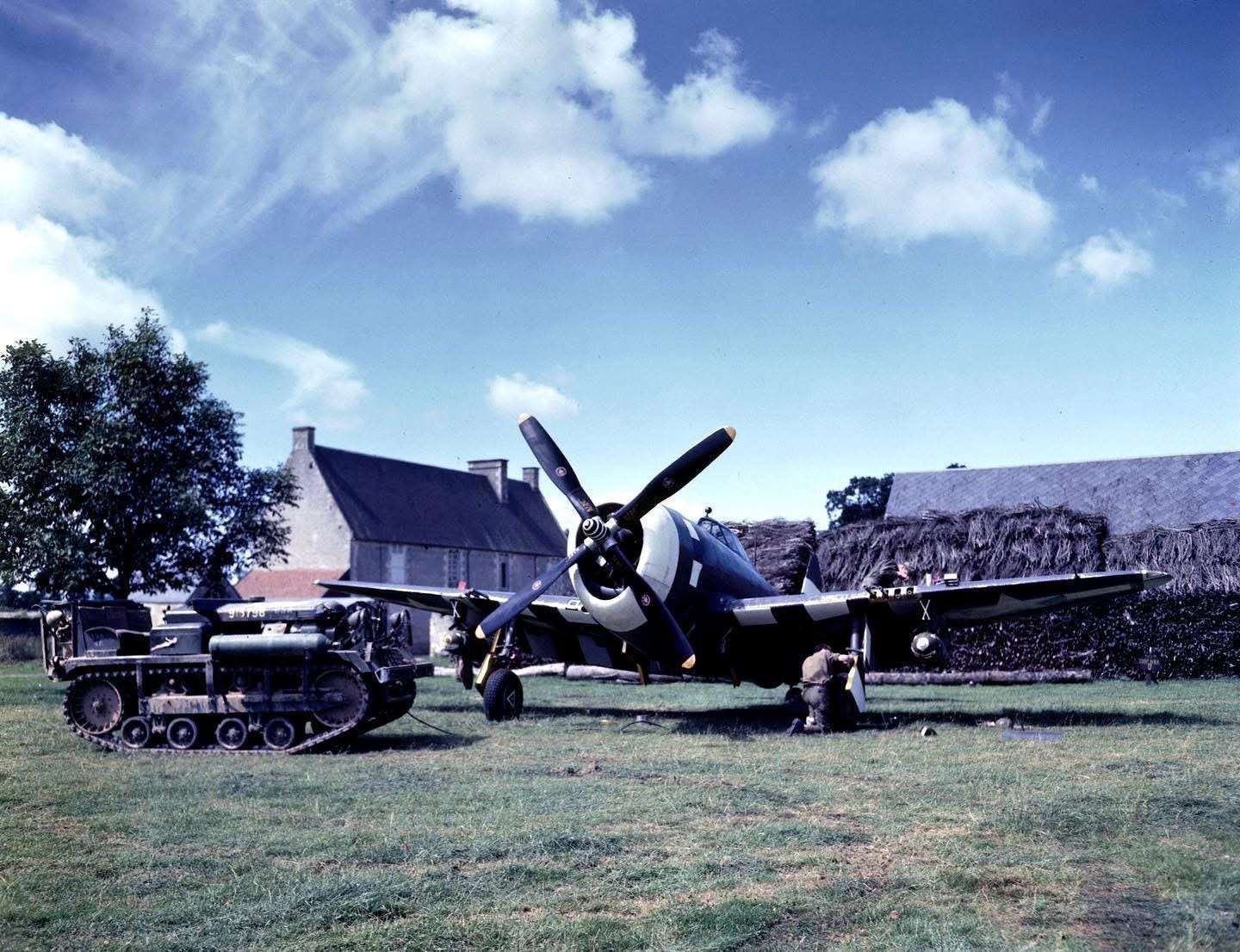 The Republic P-47D Thunderbolt 'Miss Second Front' undergoing maintenance near Cardonville, Normandy, August 1944. (Original color photo by Frank Scherschel, LIFE Magazine)