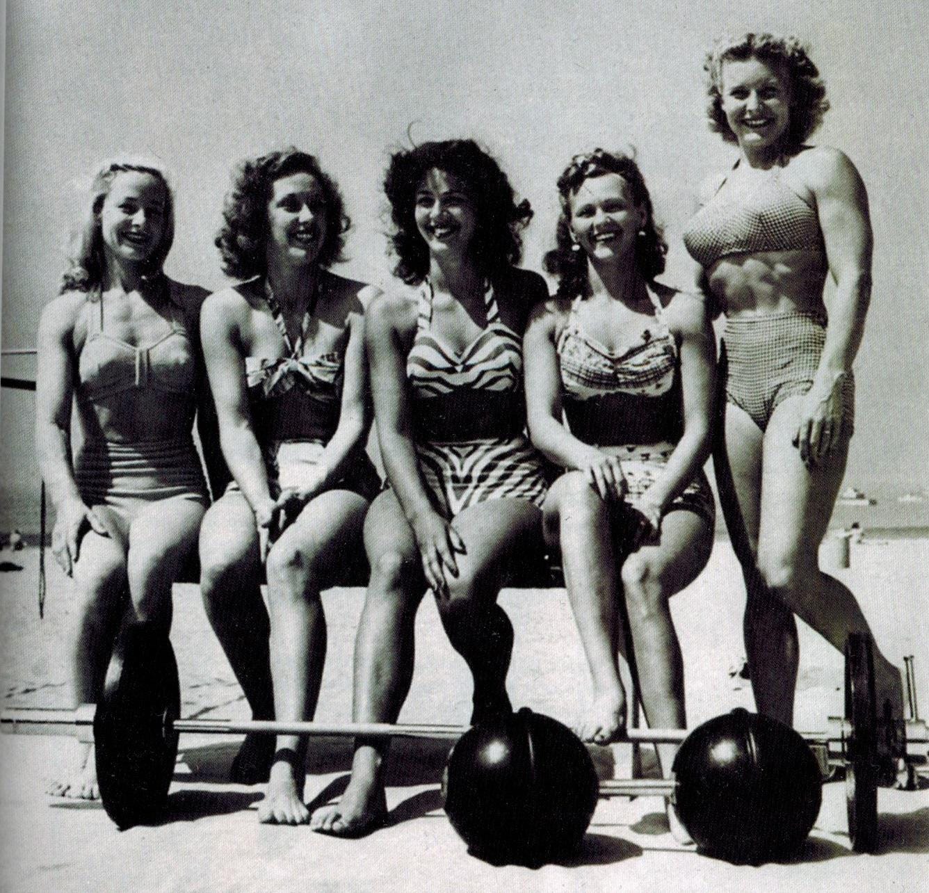 Pioneering gym owner Abby Stockton (right) with stunt double Relna Brewer (left) and friends at her all-women gym in Santa Monica, California, 1946.