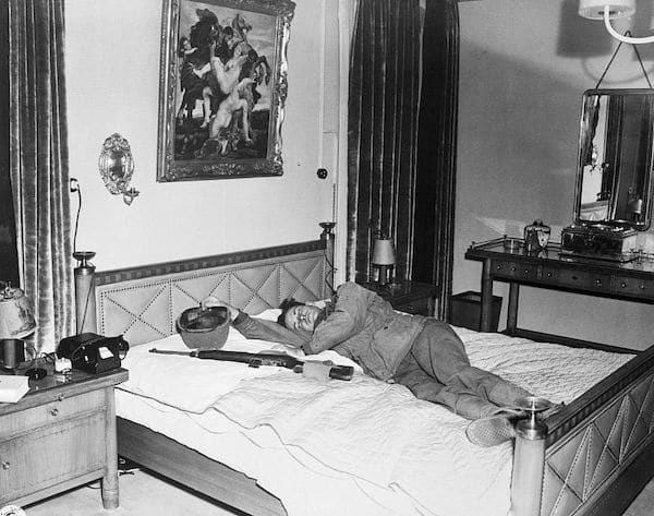 A poignant image of a battle-weary soldier from George S. Patton’s Third Army finding rest on Hermann Goering's luxurious bed in 1945.