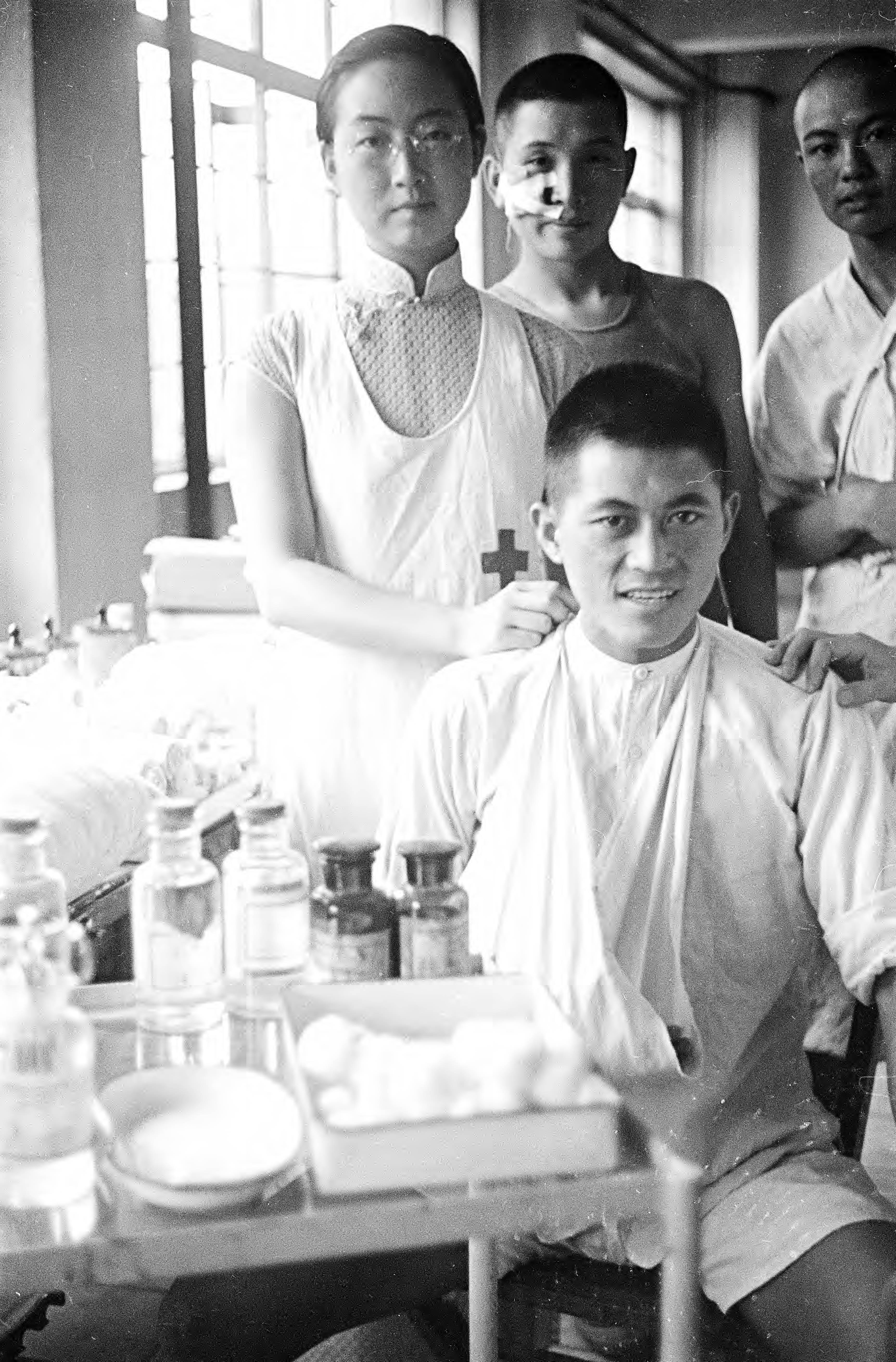 Medical staff diligently attending to a patient in a Shanghai hospital during the Second Sino-Japanese War, 1937, captured by Harrison Forman.