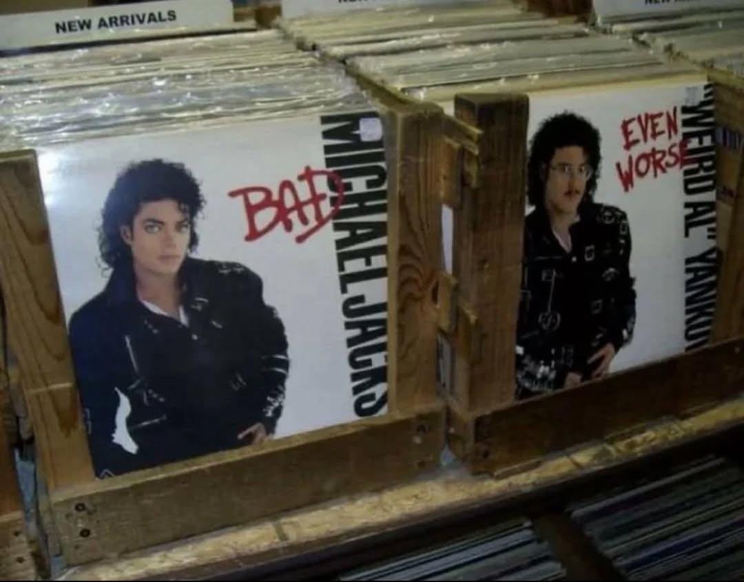 The iconic albums Michael Jackson's 'Bad' and Weird Al's 'Even Worse' side by side, a perfect pop-meets-parody moment from 1988.