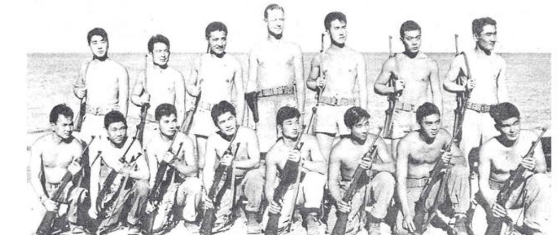 Nisei (second-generation Japanese-American) soldiers and their commander during an OSS Detachment 101 Guerrilla Warfare exercise on Catalina Island, California, September 1944.