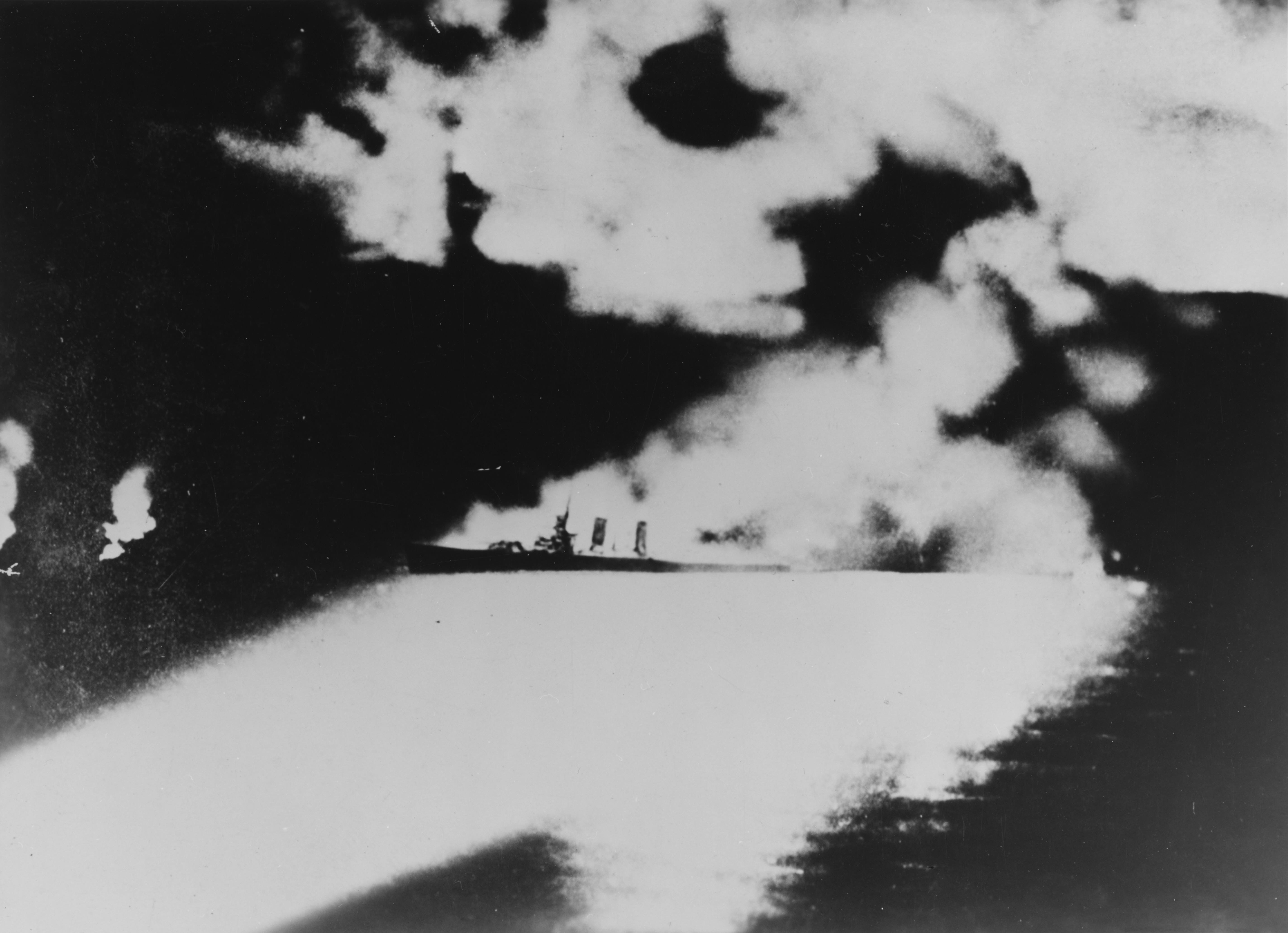 The USS Quincy ablaze, illuminated by Japanese searchlights during 'The Worst Defeat in US Navy History' at the Battle of Savo Island, August 9, 1942.