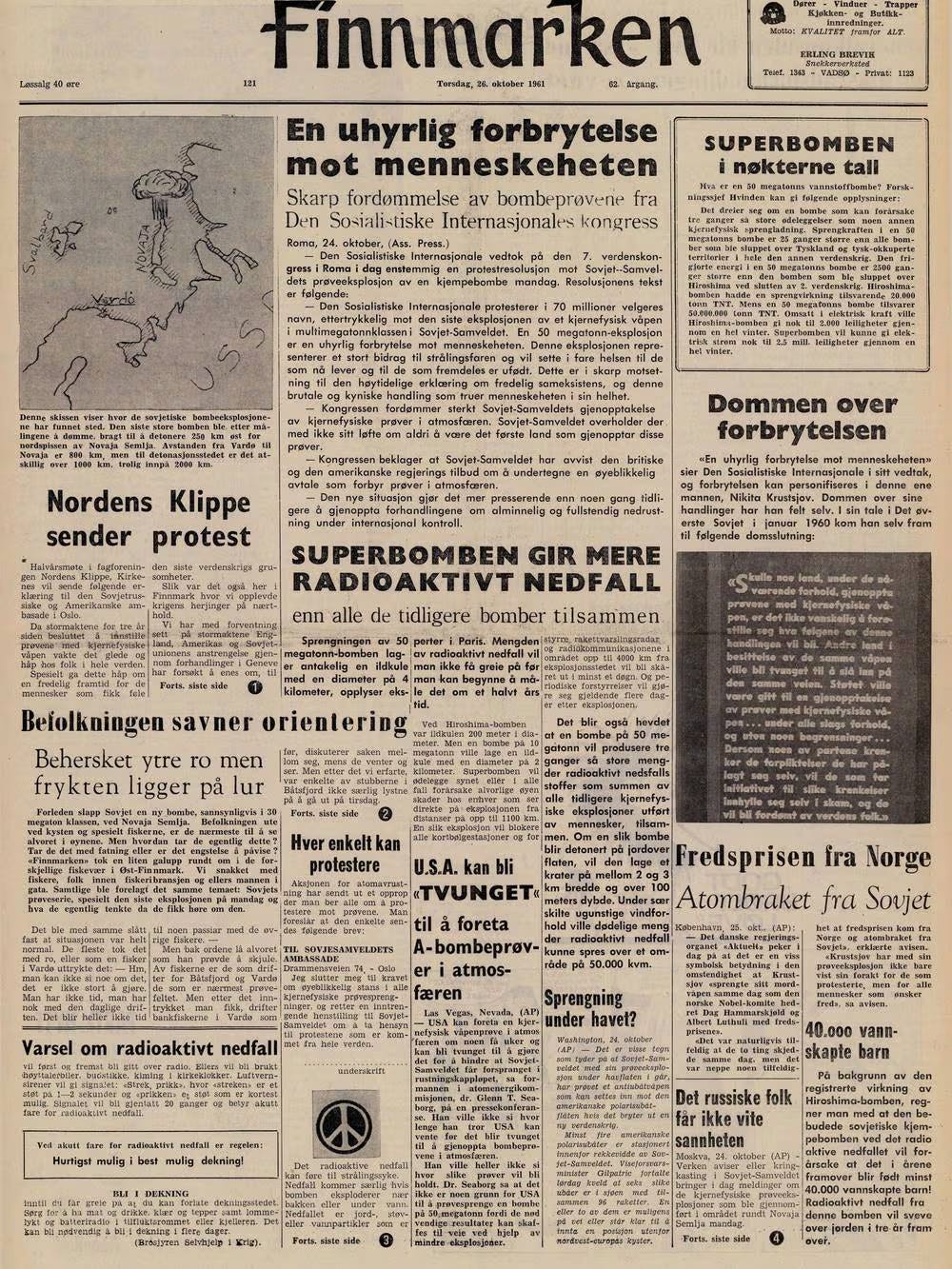 Newspaper warnings for Vardø, Norway residents concerning the impending Tsar bomb test on October 26, 1961, whose distant explosion still impacted local fisheries.