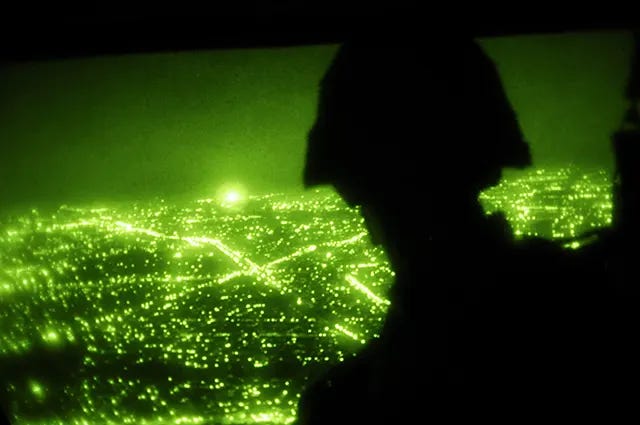 U.S. Army Sgt. John Butler of the 11th Psychological Operations Task Force observes Sadr City, Baghdad, from a UH-60 Black Hawk during a leaflet drop on October 2, 2008.