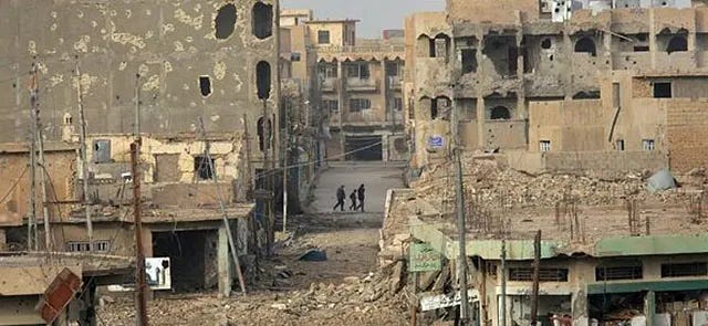 A city street in Ramadi, heavily damaged by intense urban fighting in 2006, highlighting the devastation of conflict.