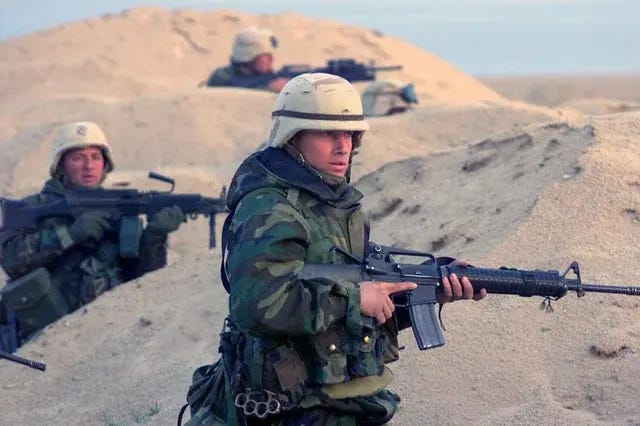US Marines escort captured enemy prisoners across the Iraqi desert to a holding area on March 21, 2003, in the early days of the invasion.