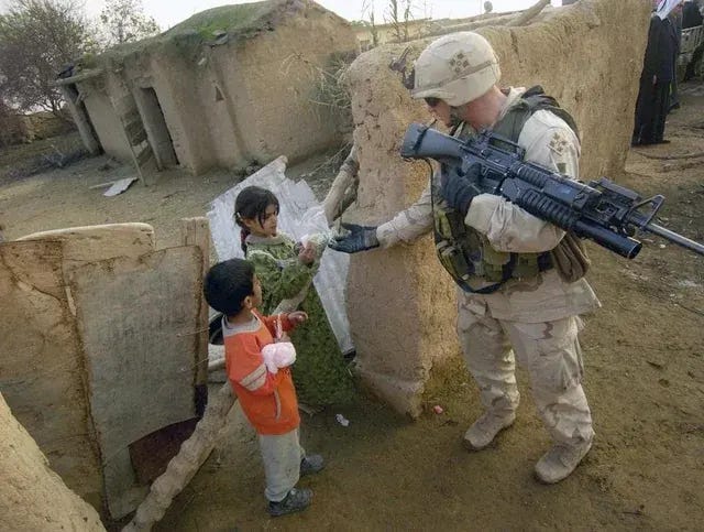A 4th Infantry Division soldier distributes gifts to children in a small village near Riyad, Iraq, in 2004, showcasing humanitarian efforts.