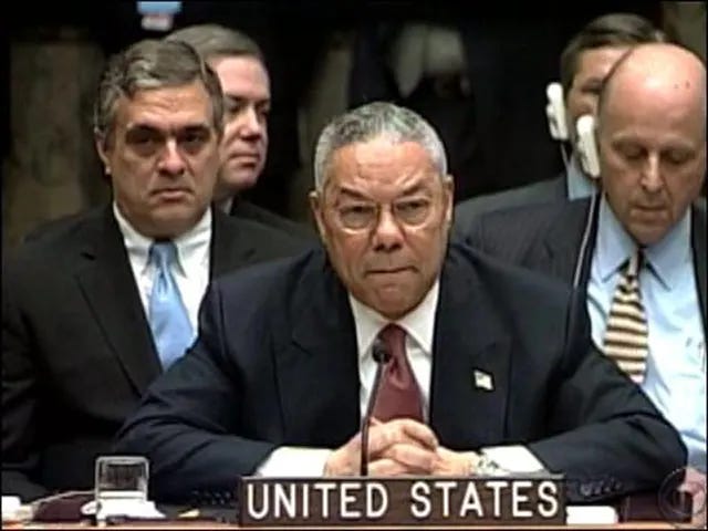US Secretary of State Colin Powell presents evidence of weapons of mass destruction, including a model anthrax vial, to the United Nations Security Council.