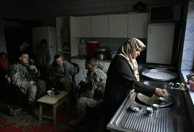 An Iraqi woman continues her daily chores while US soldiers from Baker Company, 2-12 Infantry Battalion, temporarily occupy her home during a patrol in southern Baghdad, March 16, 2007.