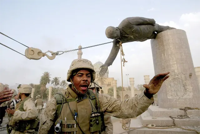 The iconic moment the statue of Saddam Hussein was toppled in Firdos Square, Baghdad, symbolizing the fall of his regime after the 2003 US invasion.