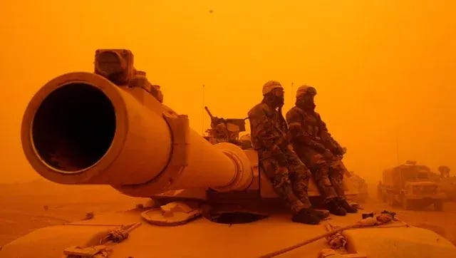 U.S. soldiers from 2nd Battalion, 70th Armor, in full chemical protection suits atop their tanks during a false alarm in a desert sandstorm near Karbala, Iraq.