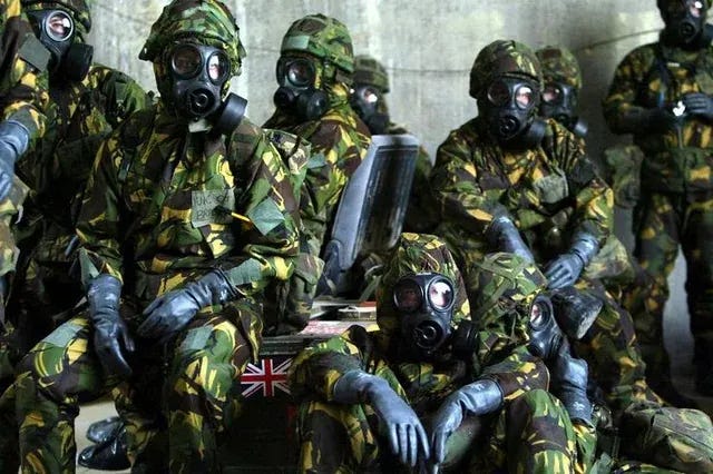 Royal Air Force personnel in full NBC suits await a potential Scud missile attack in a bunker at their base in Kuwait on March 20, 2003, hours before the invasion.