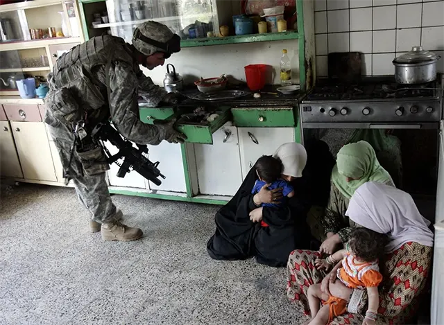 A U.S. soldier from Alpha Company, 1-17 Regiment, searches a house in eastern Baghdad on October 3, 2006, during counter-insurgency operations.