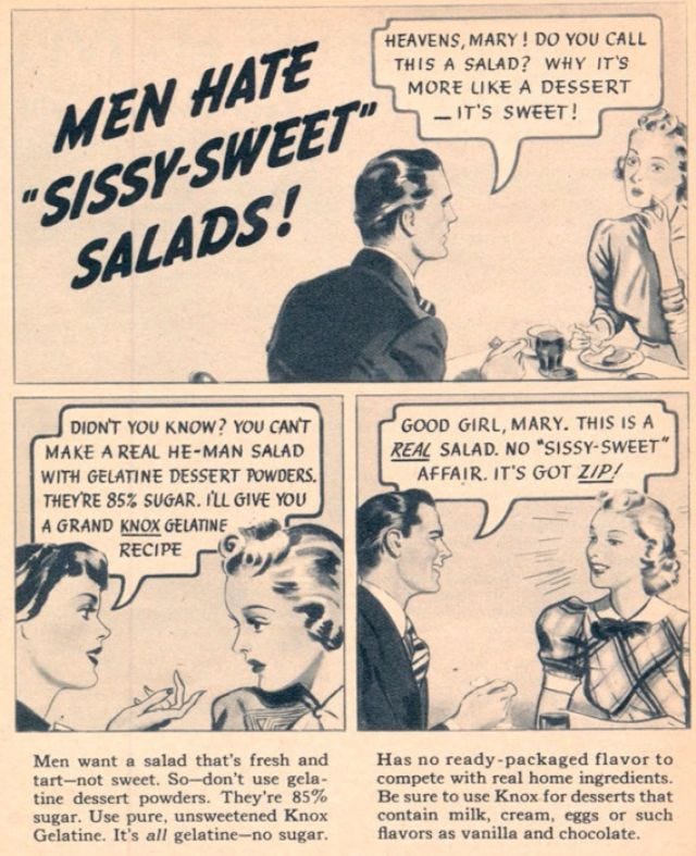 The 'perfect woman' in these ads was portrayed as serving 'he-man' food, avoiding 'sissy-sweet salads' to cater to male preferences.