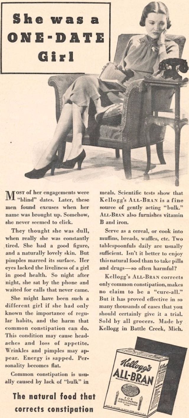 This ad ludicrously claims constipation doesn't just cause discomfort, but also destroys a woman's personality and dating prospects.