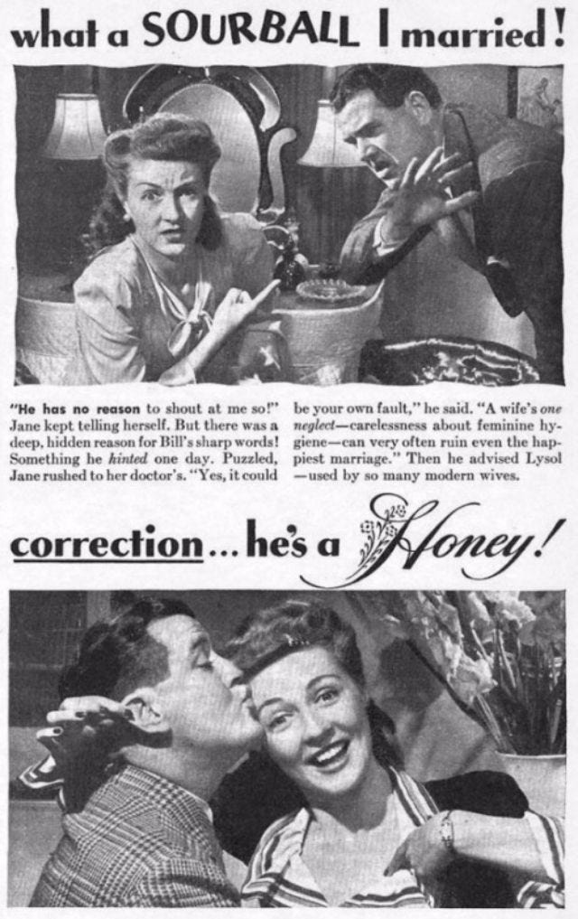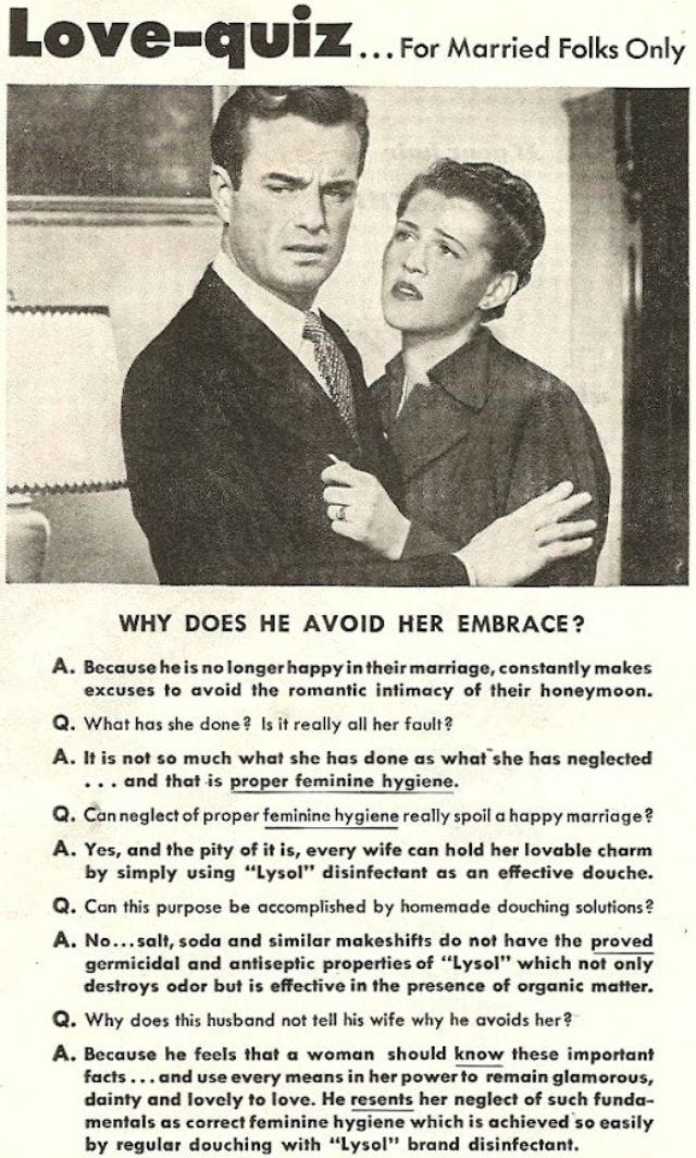 Lysol, marketed as a douche in the 1930s, ran ads depicting husbands abandoning wives over 'feminine hygiene' issues.