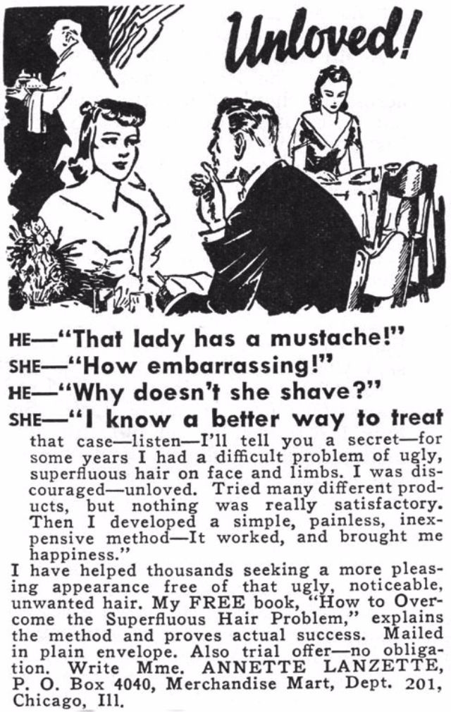 An ad shows a couple cruelly gossiping about an 'unloved' woman, implying her facial hair is the cause of her social isolation.