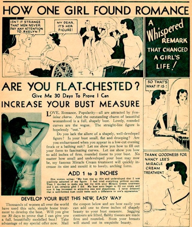 During the Depression, Ironized Yeast ads targeted 'skinny' women, promising 'weight' in the form of larger hips and breasts to fit changing ideals.