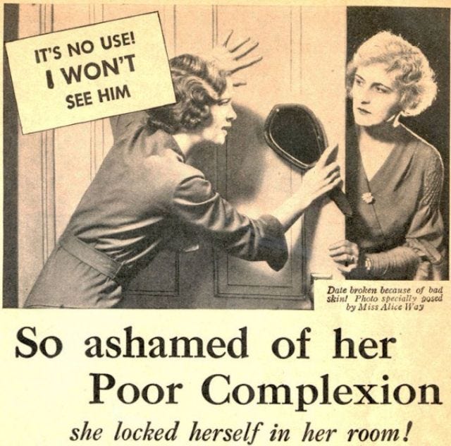A 1930s ad fearfully claimed a single zit could instantly sabotage a budding romance.