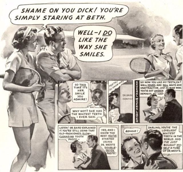 Many ads implied husbands had a 'wandering eye,' easily tempted by trivial physical imperfections like less-than-white teeth.