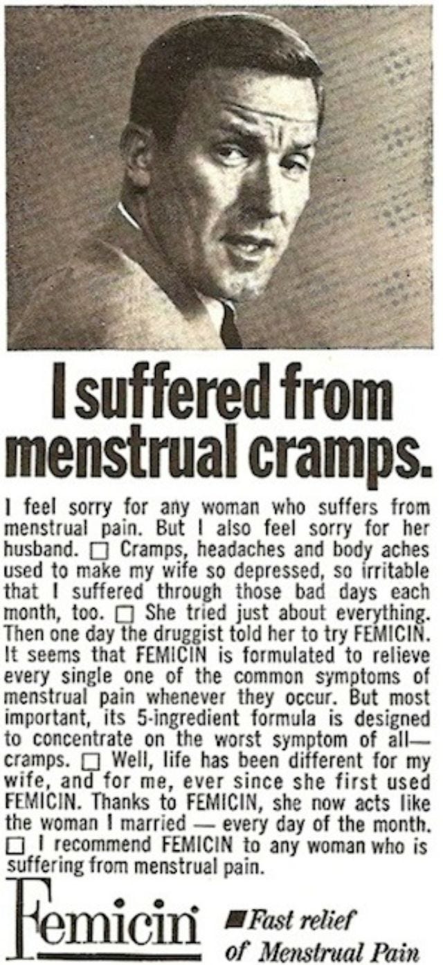 Ads bizarrely suggested that women experiencing periods had a duty not to 'make men suffer' due to their discomfort.
