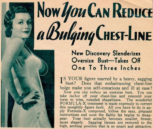 Paradoxically, another ad warns that a woman's chest-line could 'bulge too much,' showcasing conflicting body ideals.