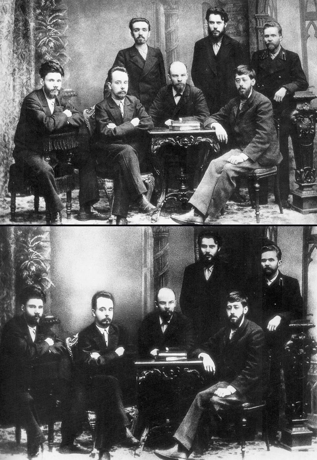 A historic 1897 image of young socialists, including Vladimir Lenin (center), before their rise to power. Alexander Malchenko (left) was less fortunate; after his 1930 execution, he was replaced with a blank white spot, a chilling example of historical erasure.