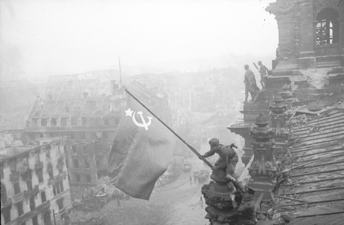 The iconic Soviet flag over the Reichstag photo, later exposed as extensively staged and altered to enhance its propaganda impact during the Battle of Berlin.