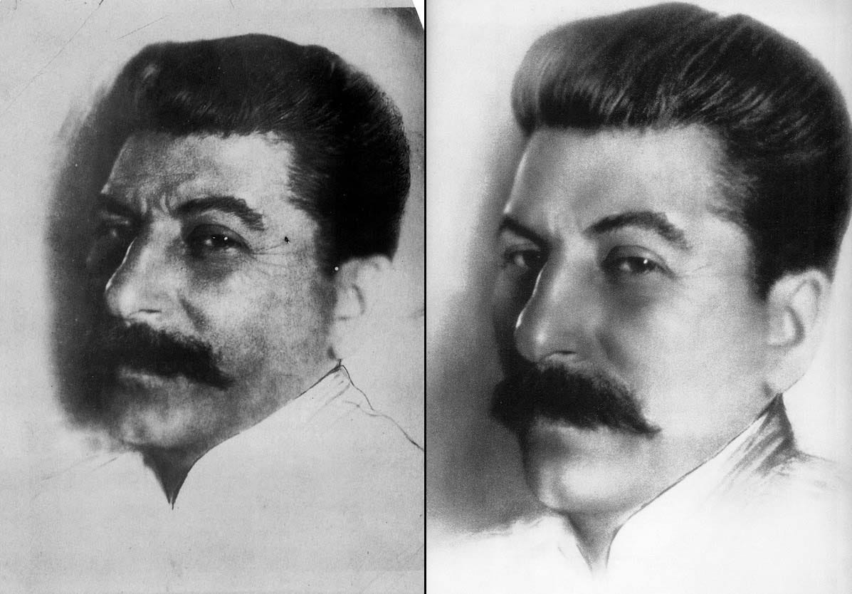 An original 1924 photo revealing Stalin's pockmarked skin, contrasted with a 1939 retouched version where his appearance was smoothed and idealized, showcasing early propaganda manipulation.