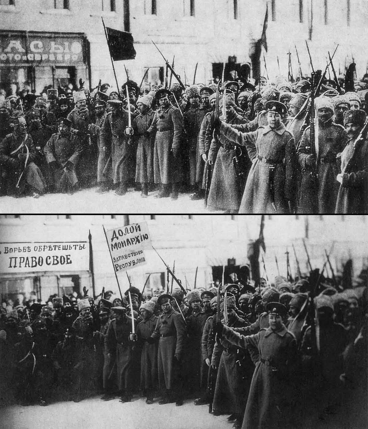 A 1920 photograph originally showing Leon Trotsky (in cap) alongside Lenin delivering a speech, contrasted with a later version where Trotsky has been completely expunged, reflecting his political downfall and eventual assassination.