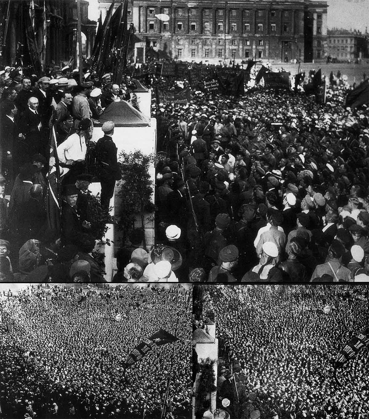 An example of photographic embellishment: Lenin addressing a crowd in 1920, with editors later digitally expanding his audience using imagery from a different photo to create a grander, fabricated scene.