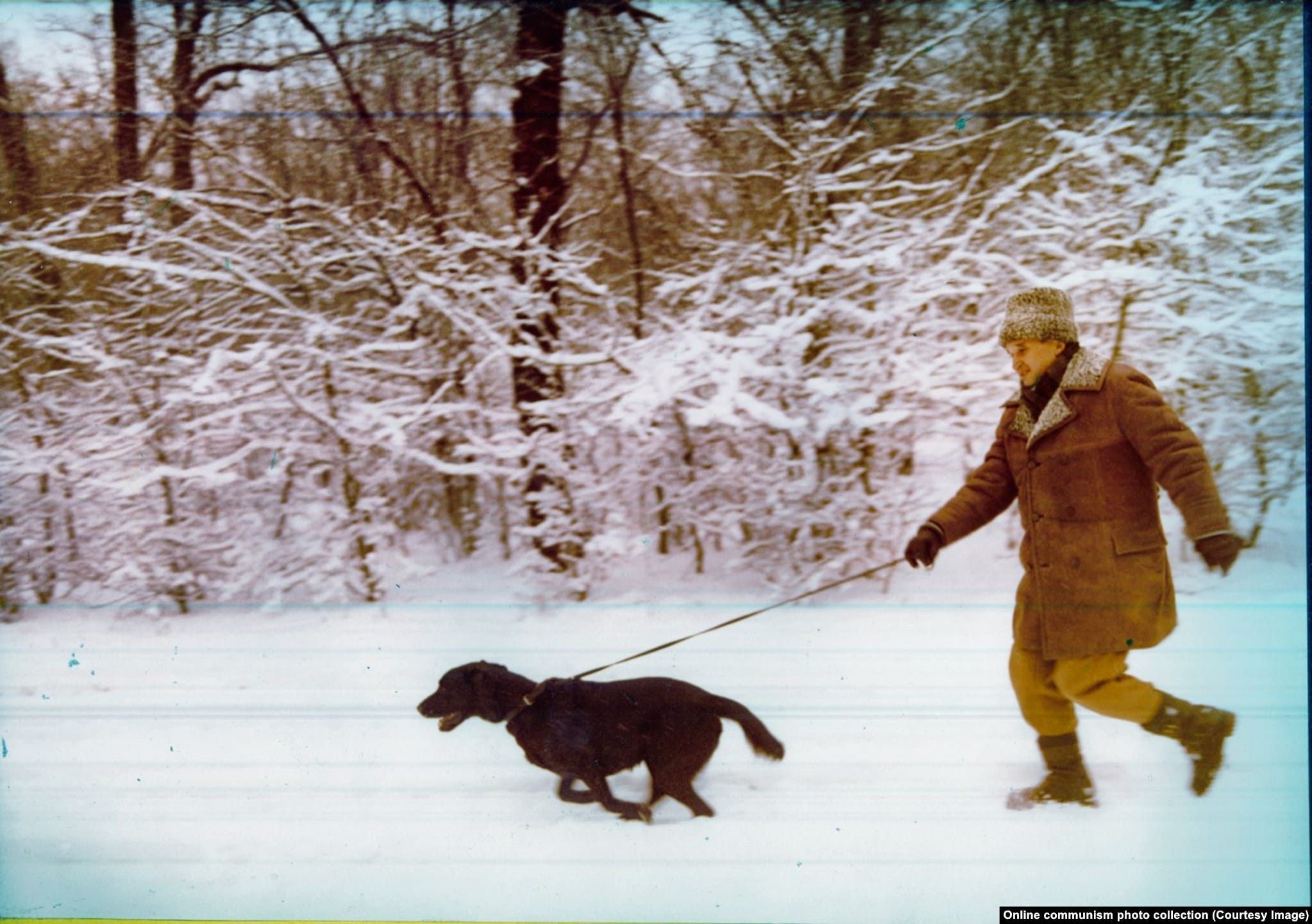The authoritarian ruler runs with a dog at an unknown location in the winter of 1981.