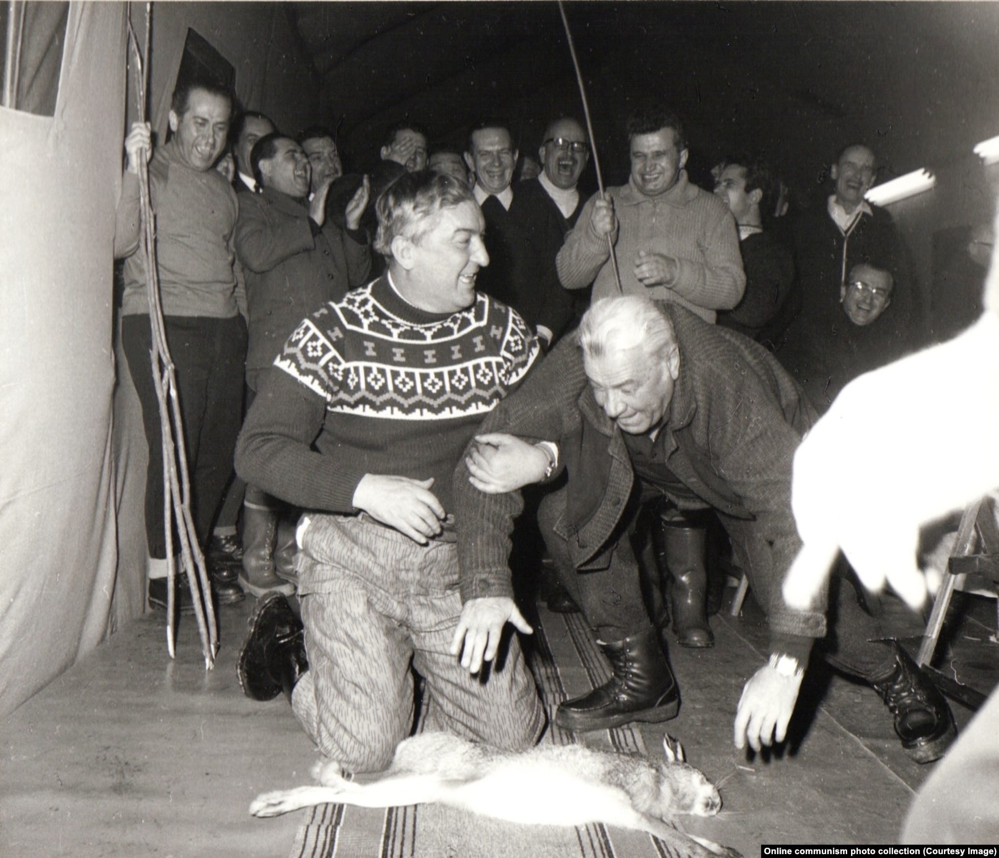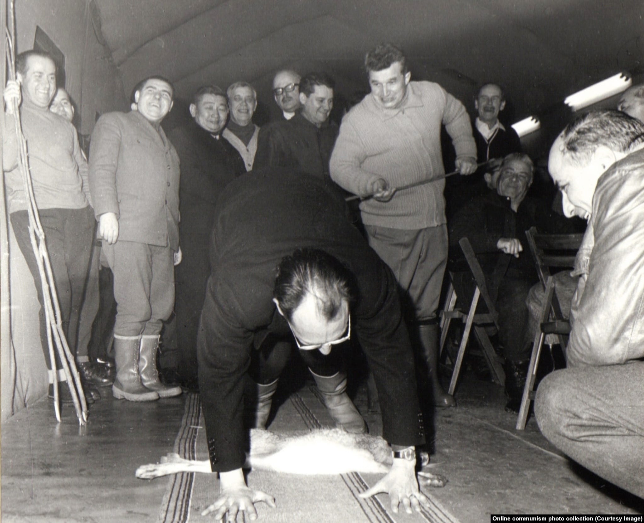 A Romanian diplomat is whipped on the backside by Ceausescu while crouching over the carcass of a hare. The photo was taken during a hunting trip with the heads of Romania’s diplomatic missions in 1969.