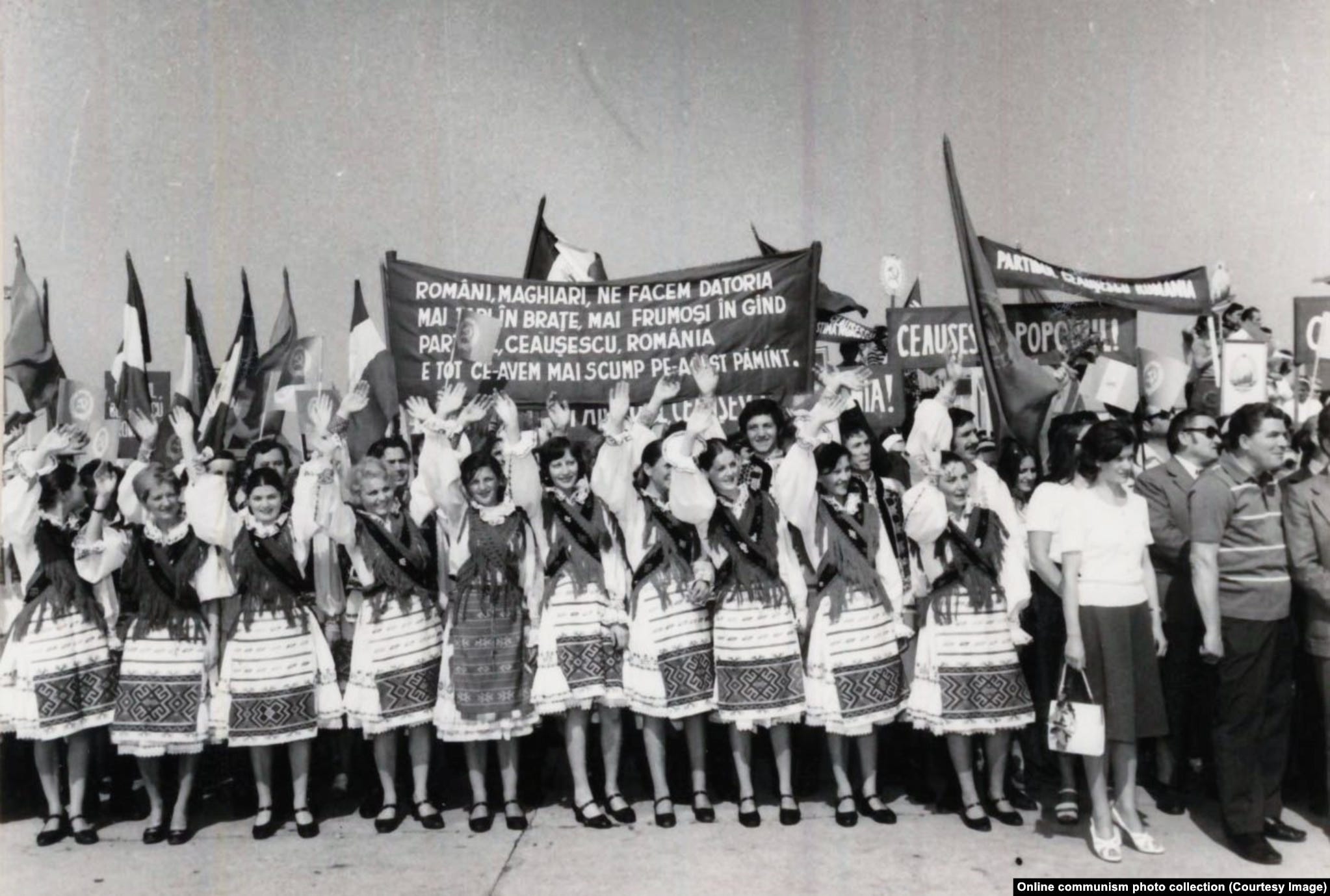 Women in the northwestern Bihor county, which has a sizable ethnic Hungarian community, welcome Ceausescu. The sign displayed in the background reads like a poem: “Romanians and Hungarians, we are fulfilling our duty; arms stronger, minds more beautiful; the Party, Ceausescu, Romania, are for us the world's most precious things.”
